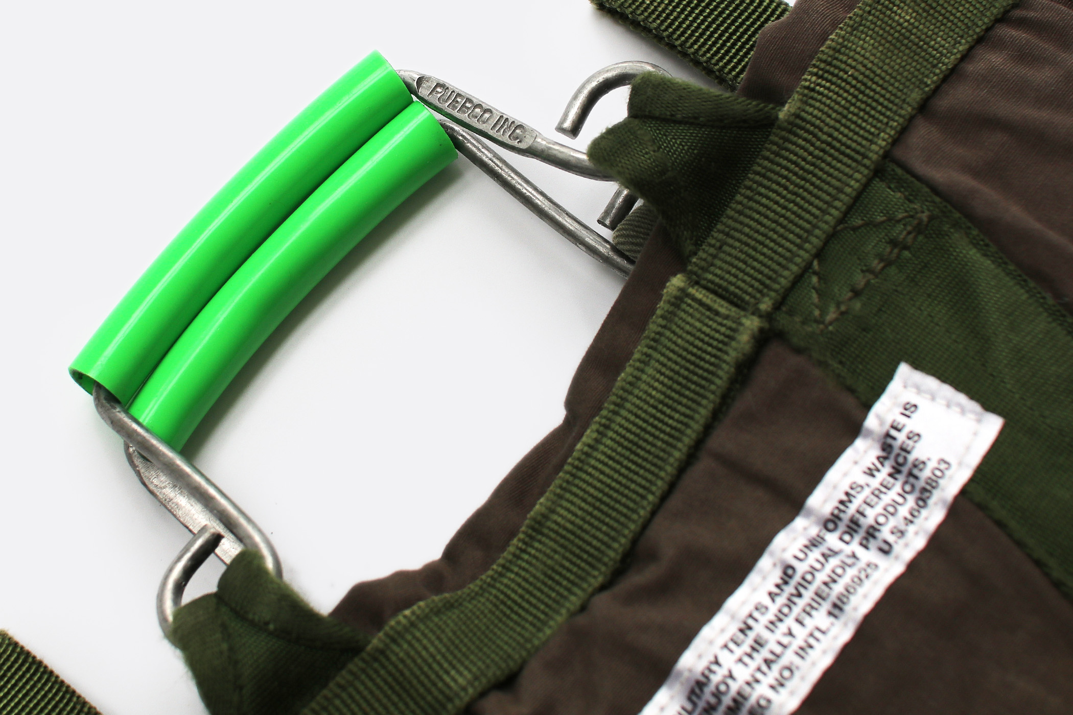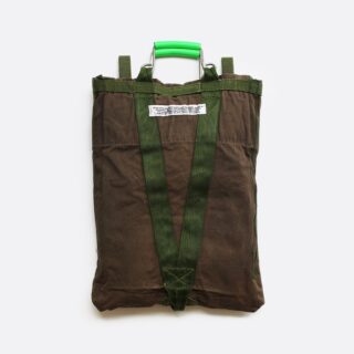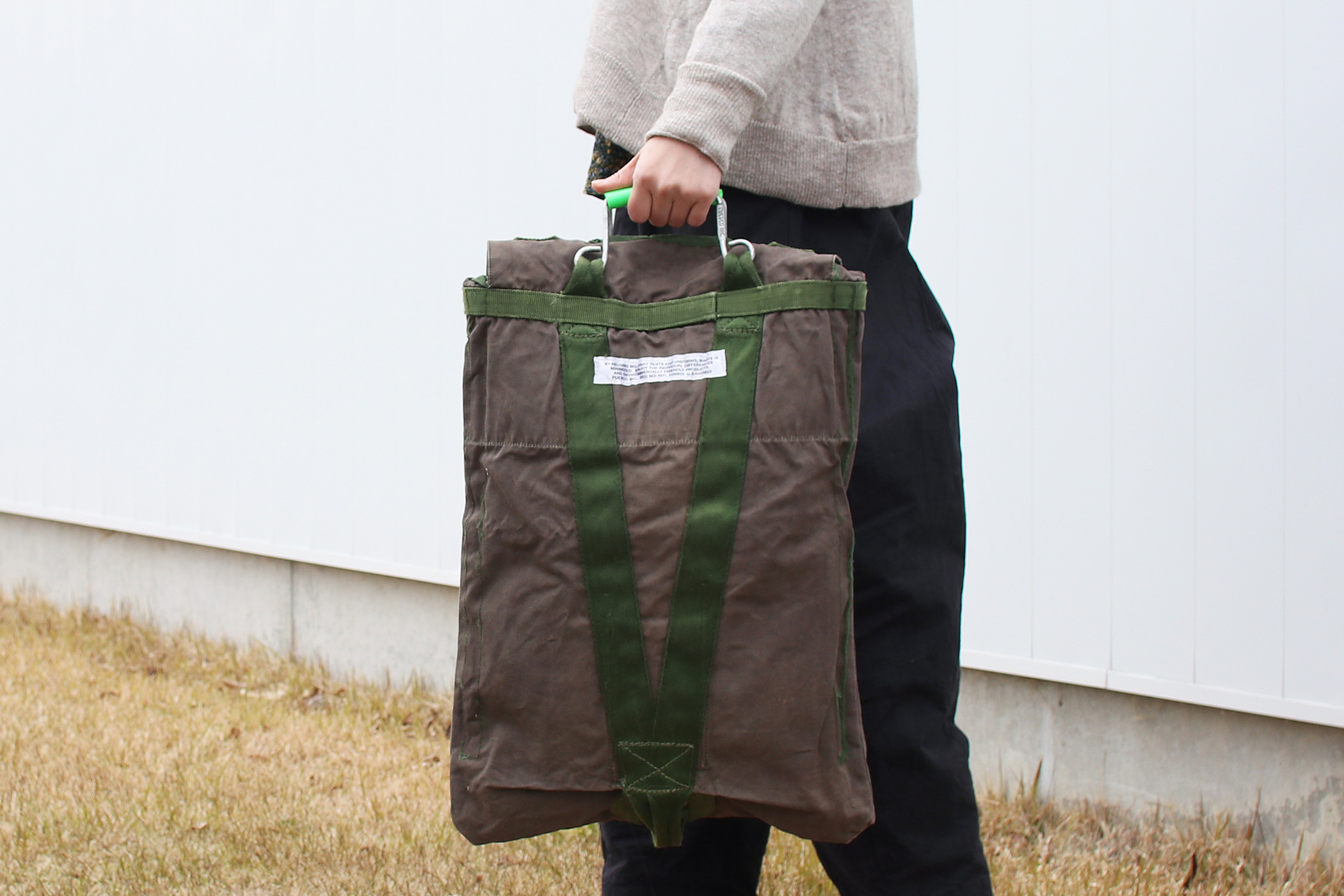 この「PUEBCO VINTAGE MATERIAL A3 BAG」は、米軍で使われていたテントやユニフォームの布を再利用。補修跡や色ムラが一点一点で違う。