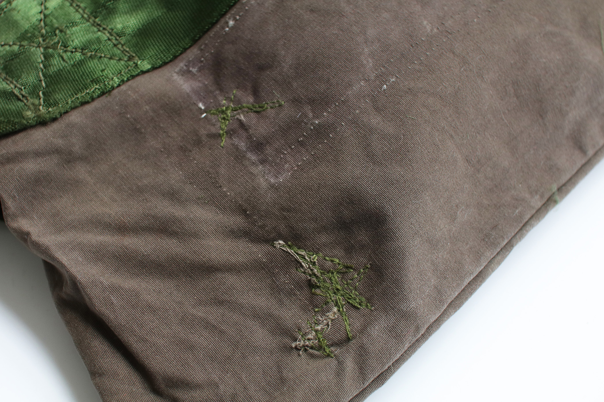 近くで見ると、縫い目の荒さや補修跡が目立ちます。普通なら欠点にされる部分。