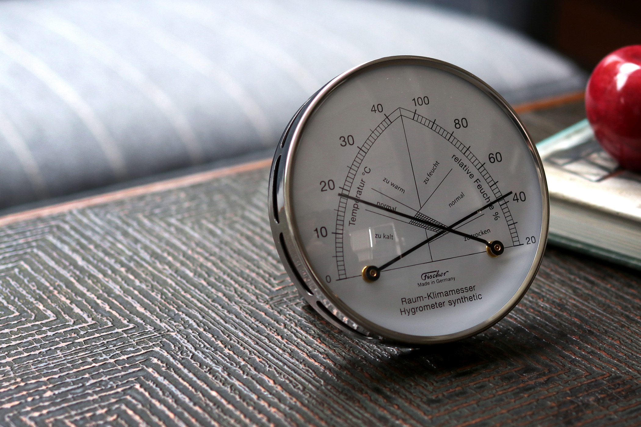 盤面には温度計と湿度計が同心円状に配置され、二本の針の交わるゾーンが「快適」を示します。