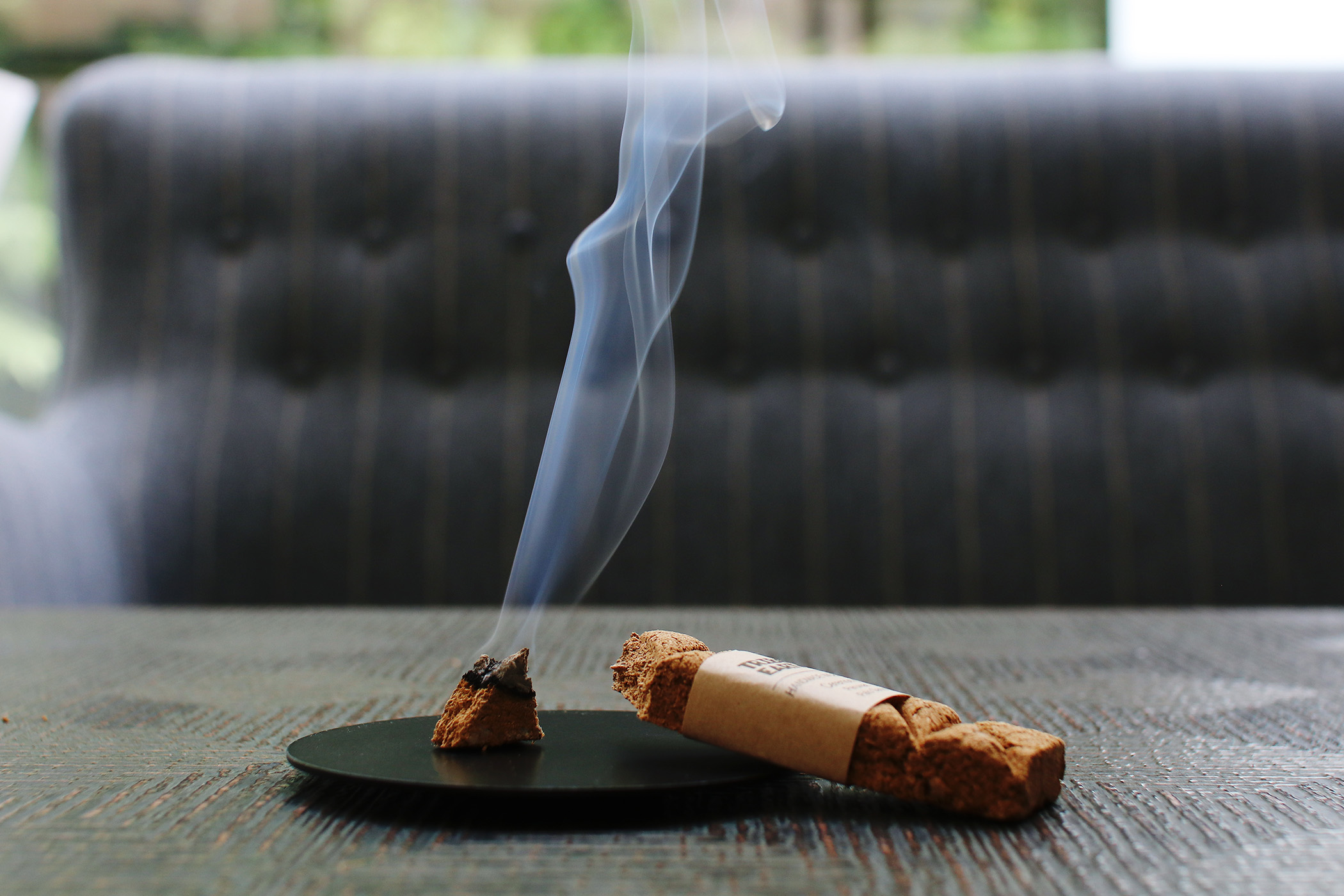 ひとつのブロックを手で折り、火を灯す。あとは小皿や耐熱トレイの上で、自然に任せて煙を立ち上らせるだけ。