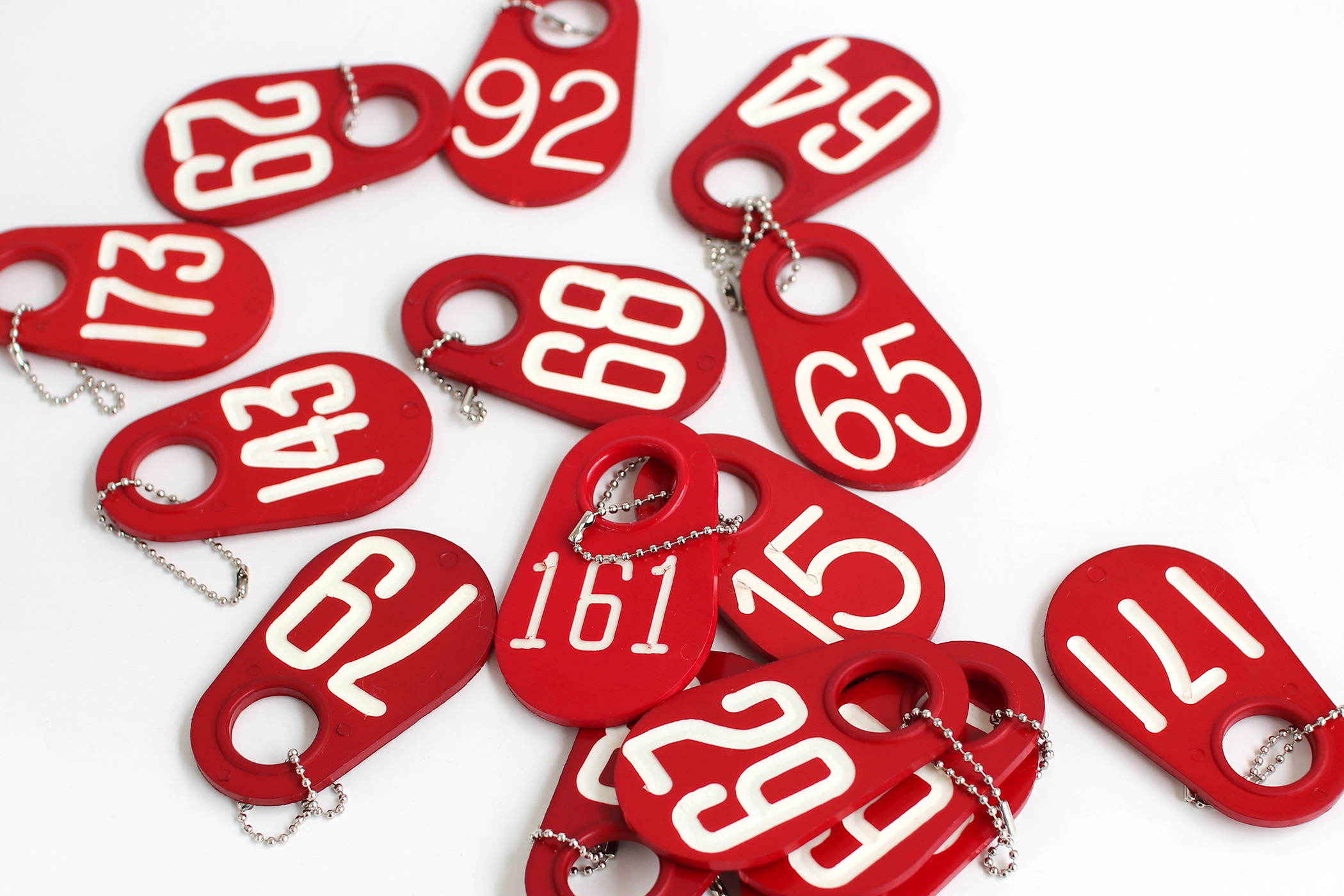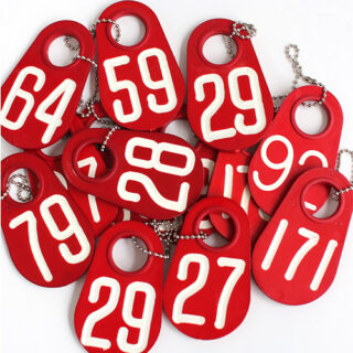 この赤い札、もとは牧場で牛の耳に付けられていた番号タグ。