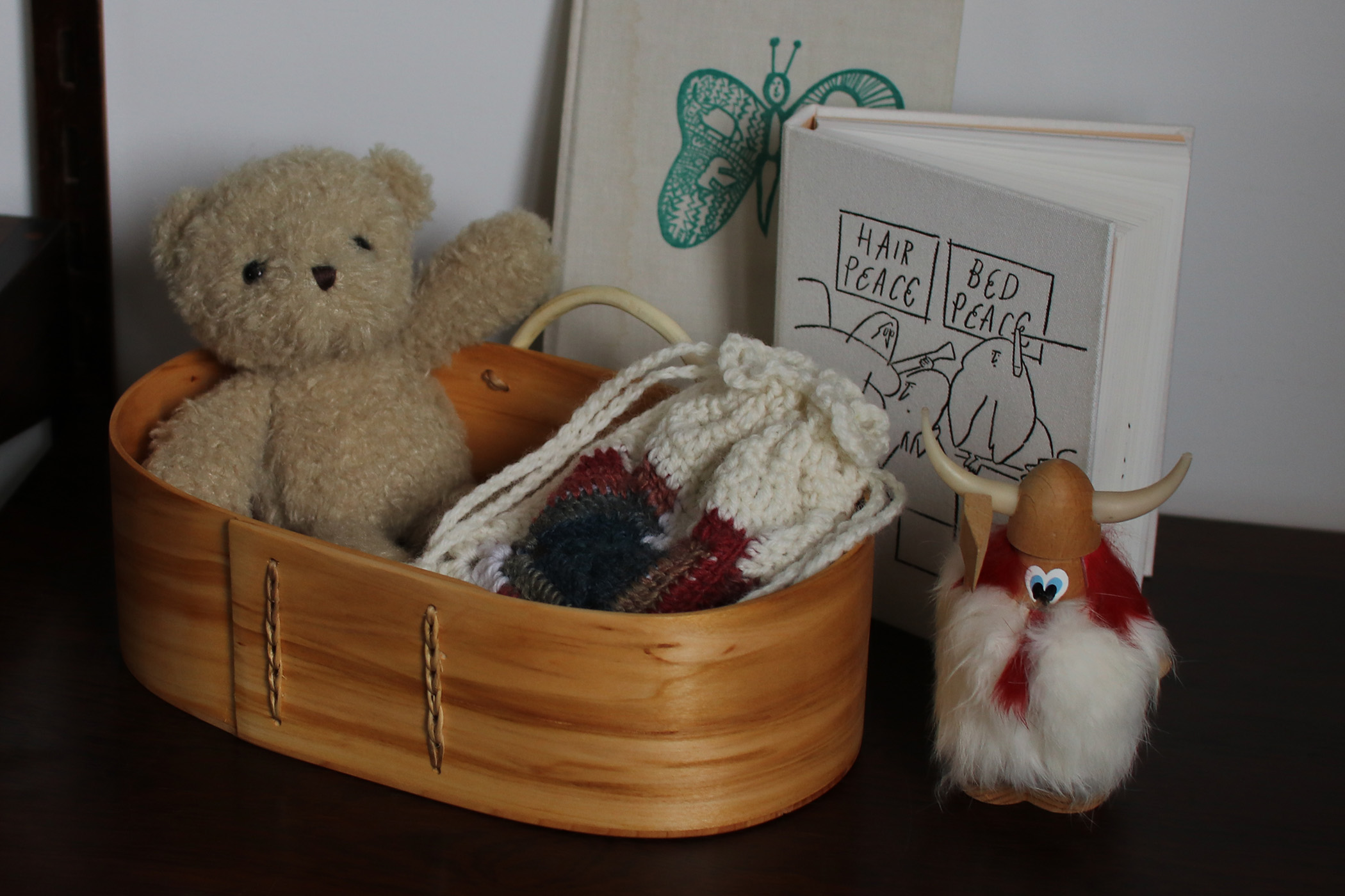 ぬいぐるみや、編みかけの袋を入れても似合う。
