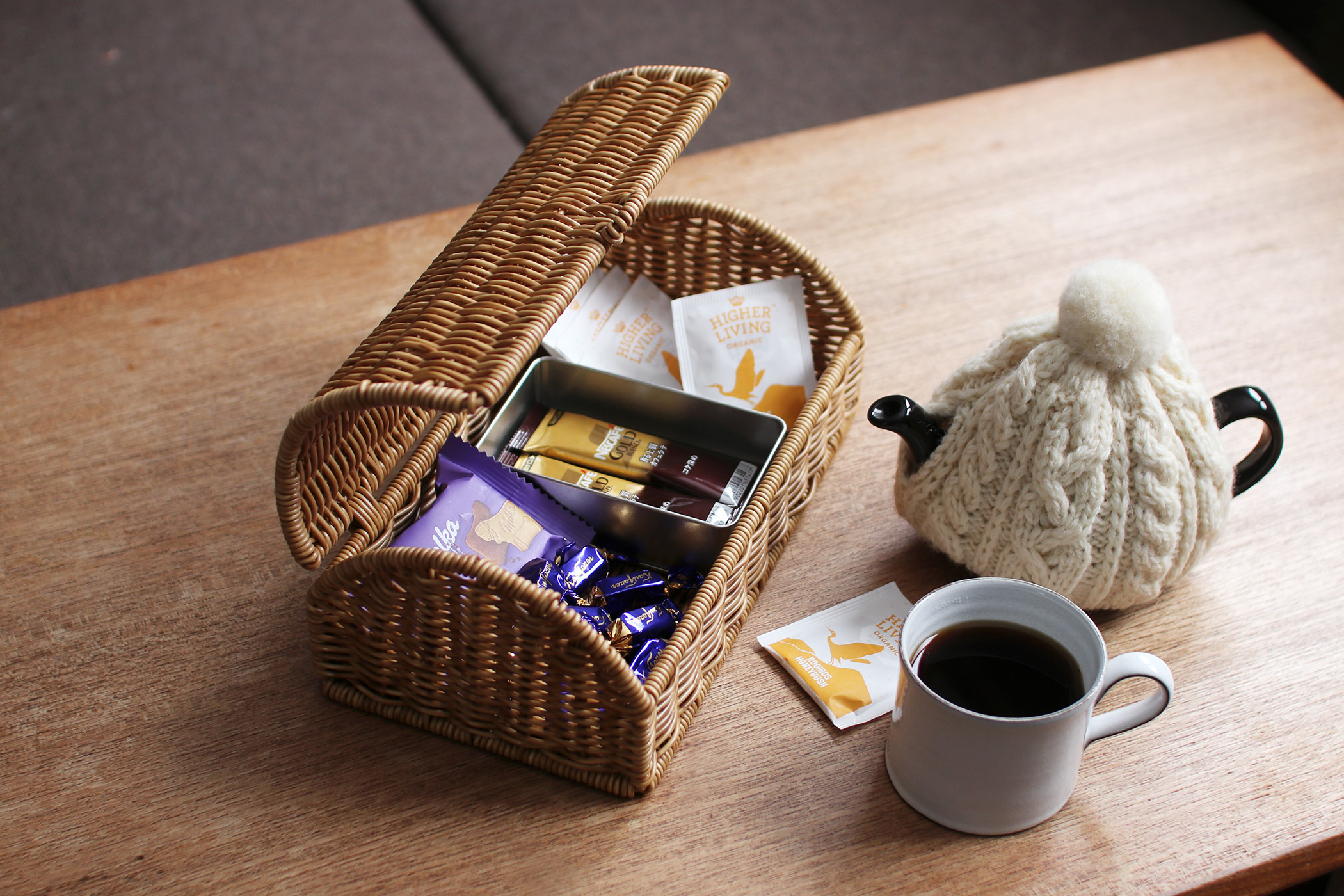 お茶の時間は来客セットに。ティーバッグ、スティックコーヒー、チョコ、角砂糖。金属トレーや小分けケースを入れておくと、配膳も片づけも迷いません。