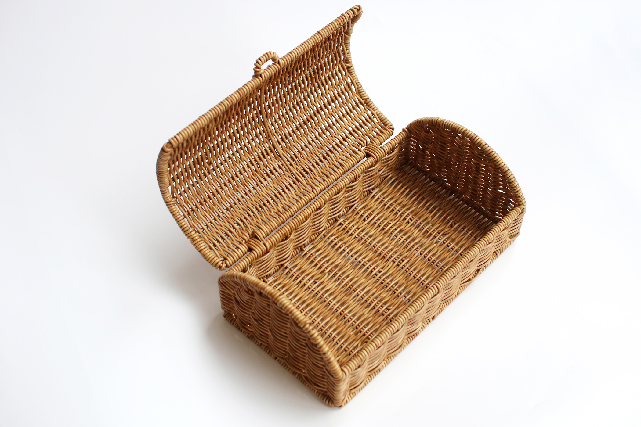 フタは本体と一体で編み込まれた簡易ヒンジ。大きく開いて自立するので、中のものが見渡せて取りやすい。戻すのもワンモーション。
