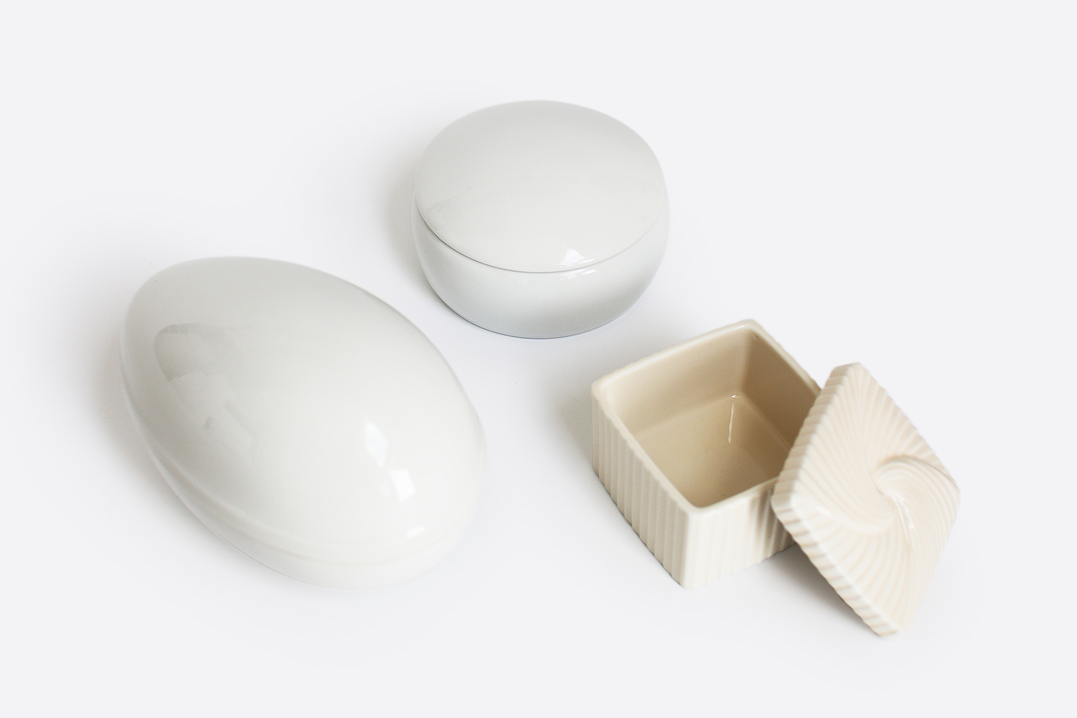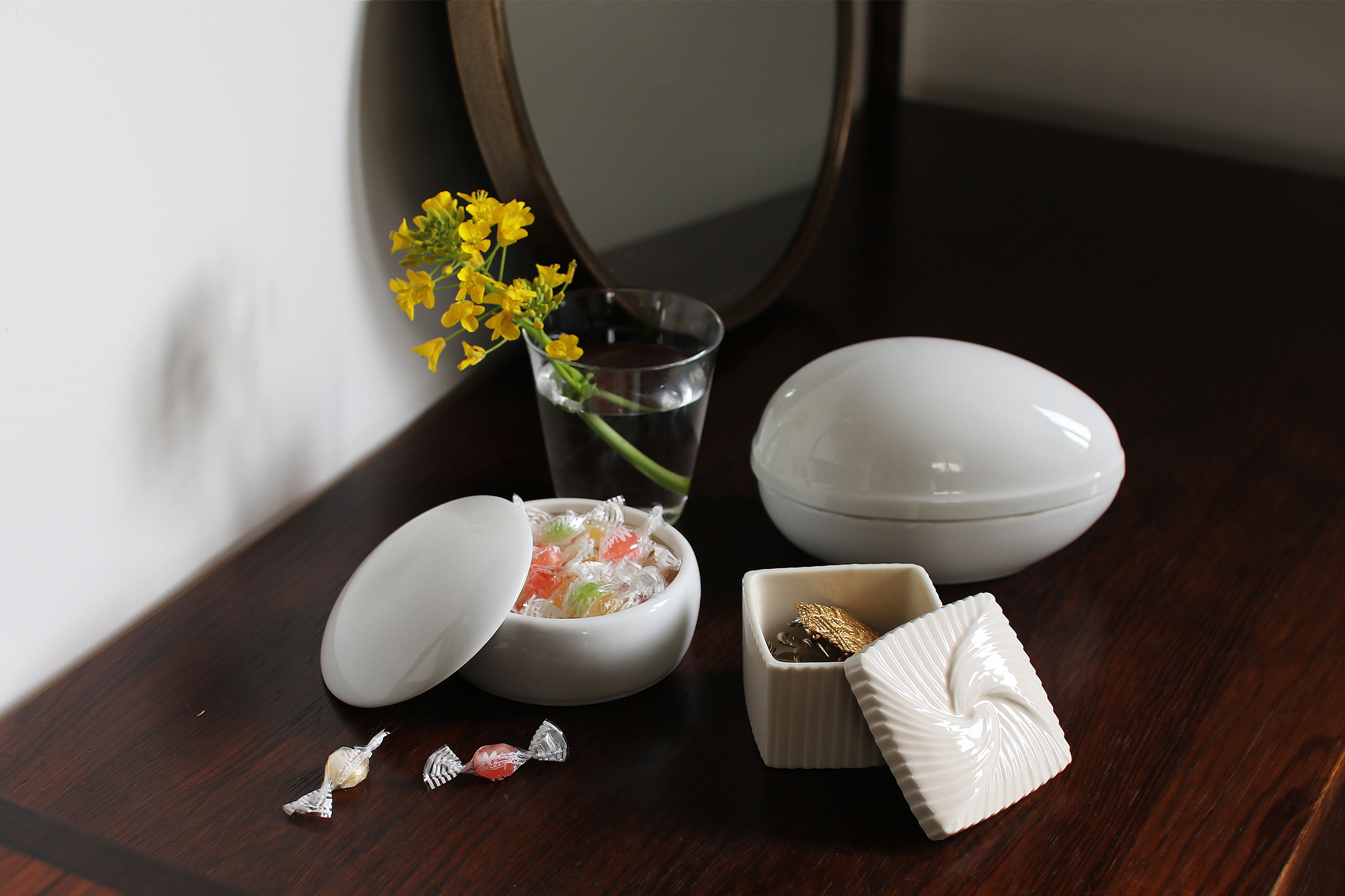 手のひらにおさまるまるい器、しかくい器。