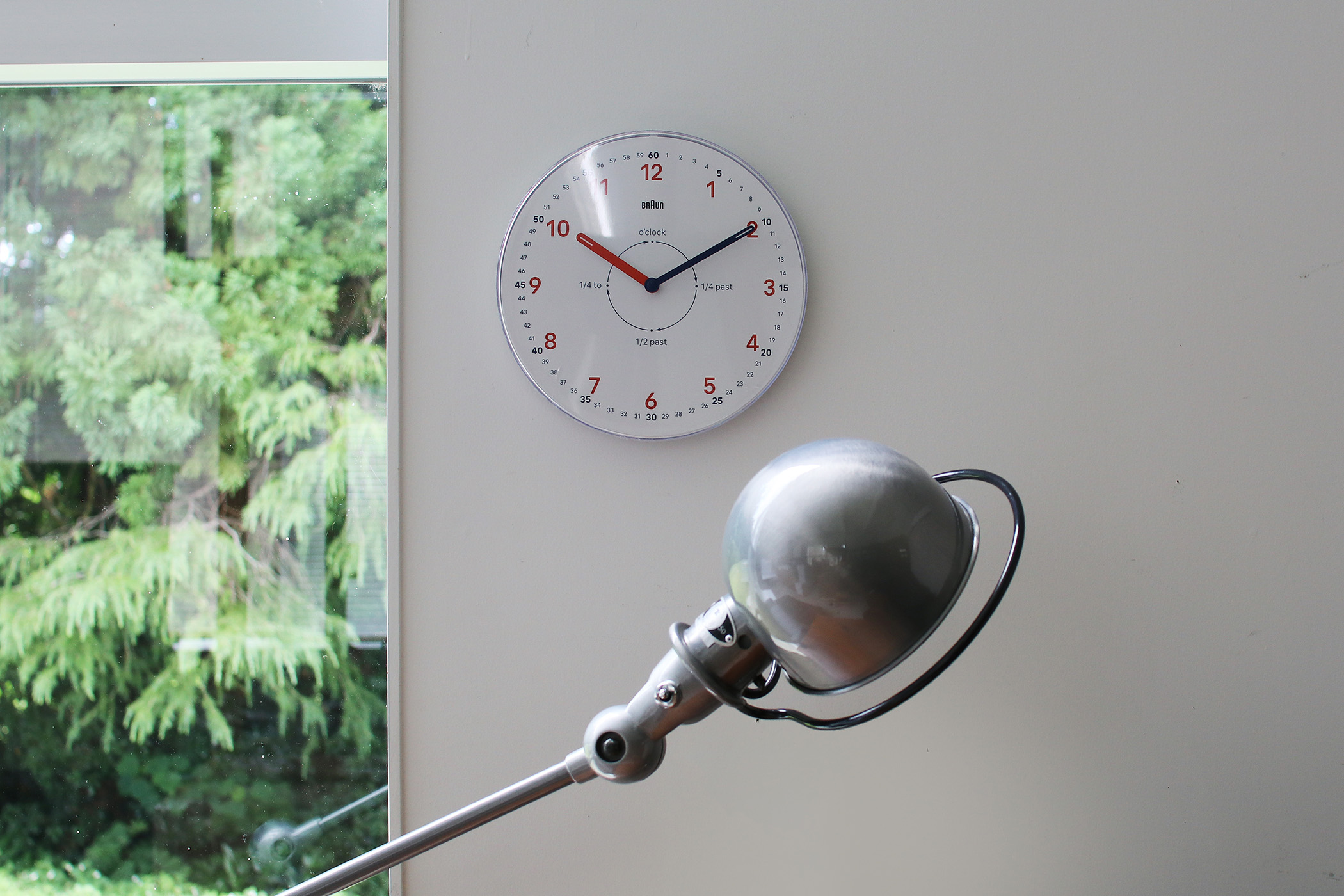 視認性の高さは、さすがBRAUN。部屋のどこに座っても読み取りやすいし、赤と青の配色が、白い盤面にちょうどいいアクセントになってる。