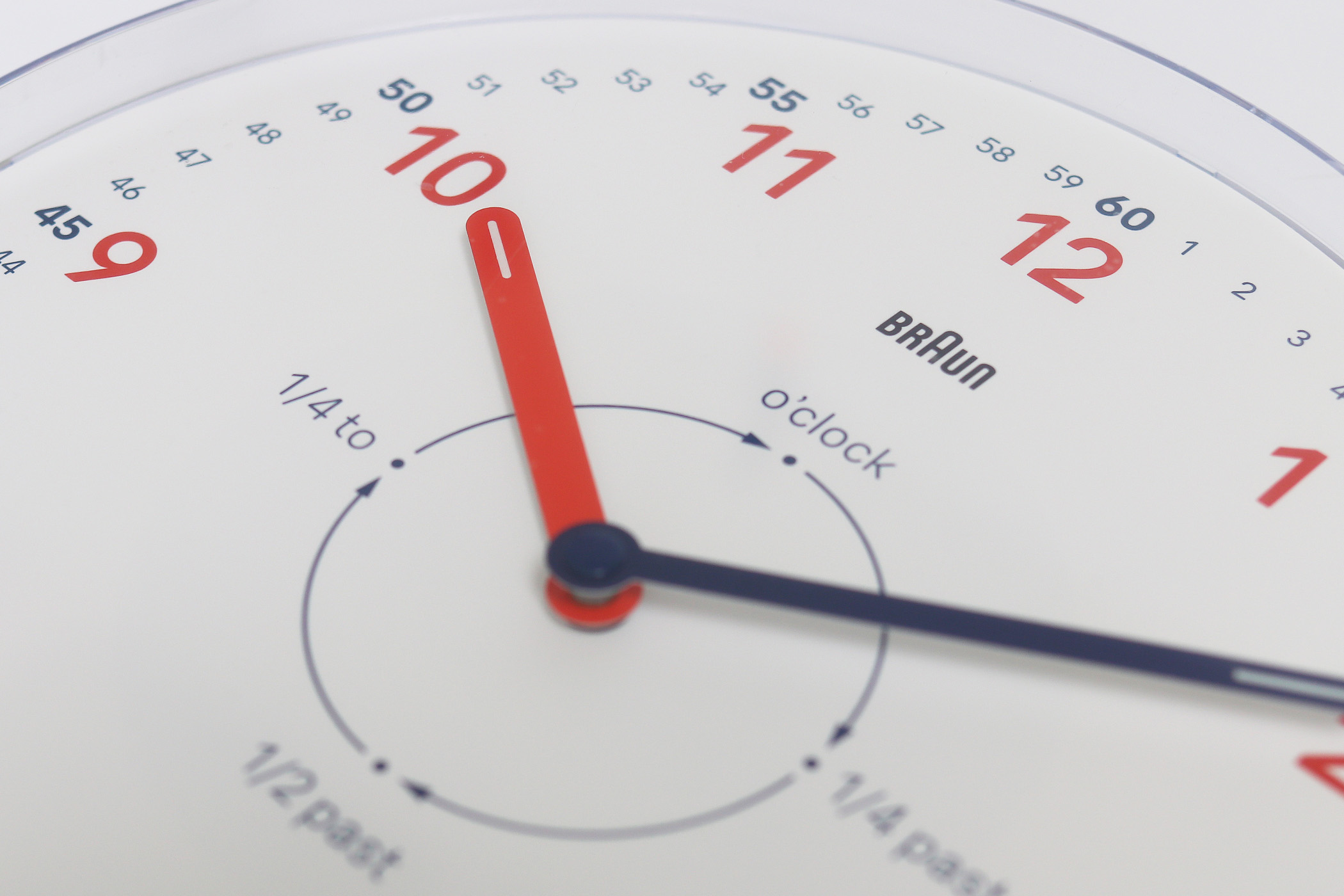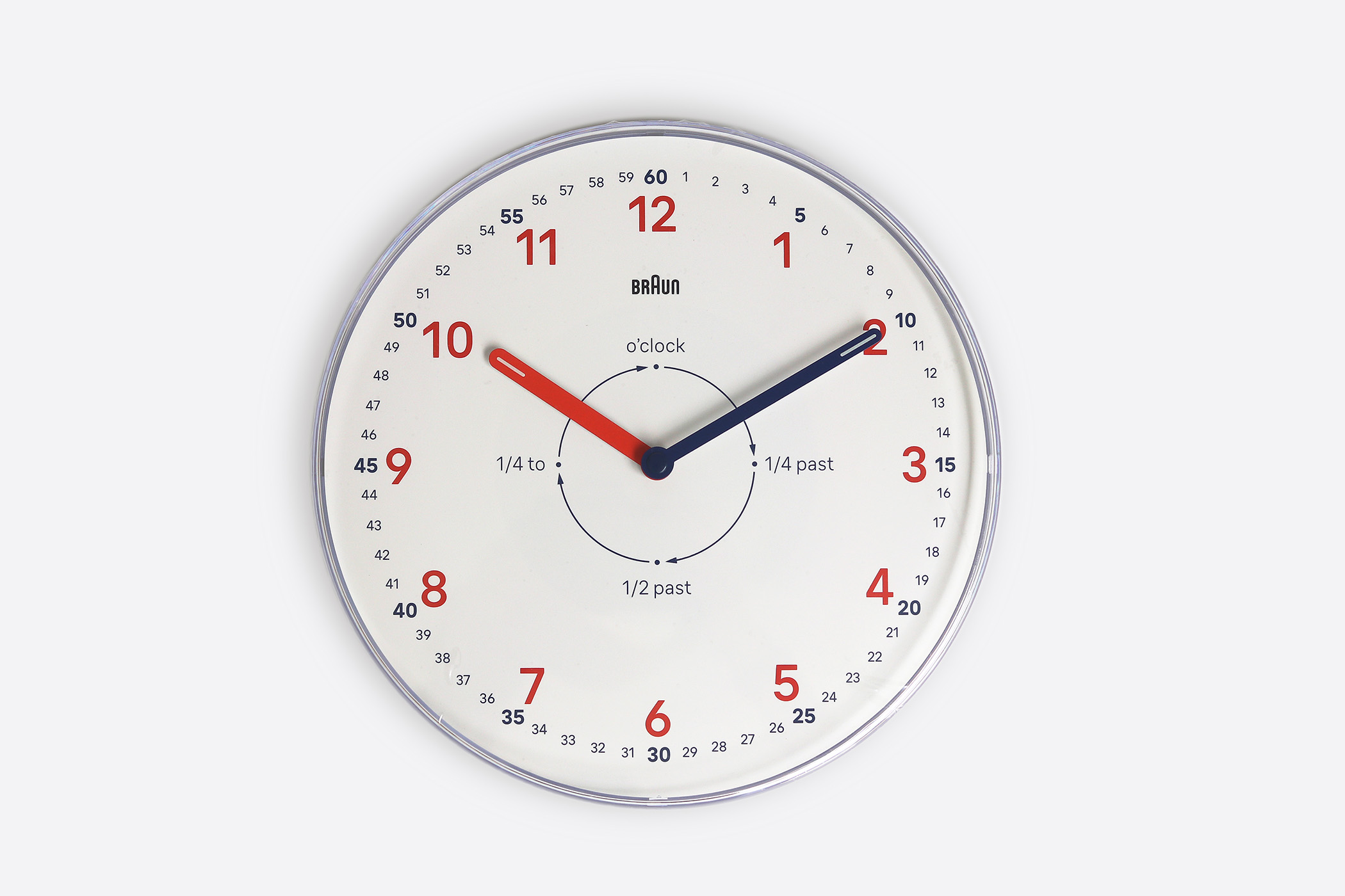 赤い数字が「時」、青い外周が「分」。さらに中央には o’clock / 1/4 past / 1/2 past / 1/4 to のガイドまで入っている。教材っぽくならないギリギリのラインを、BRAUNがうまく攻めた感じ。