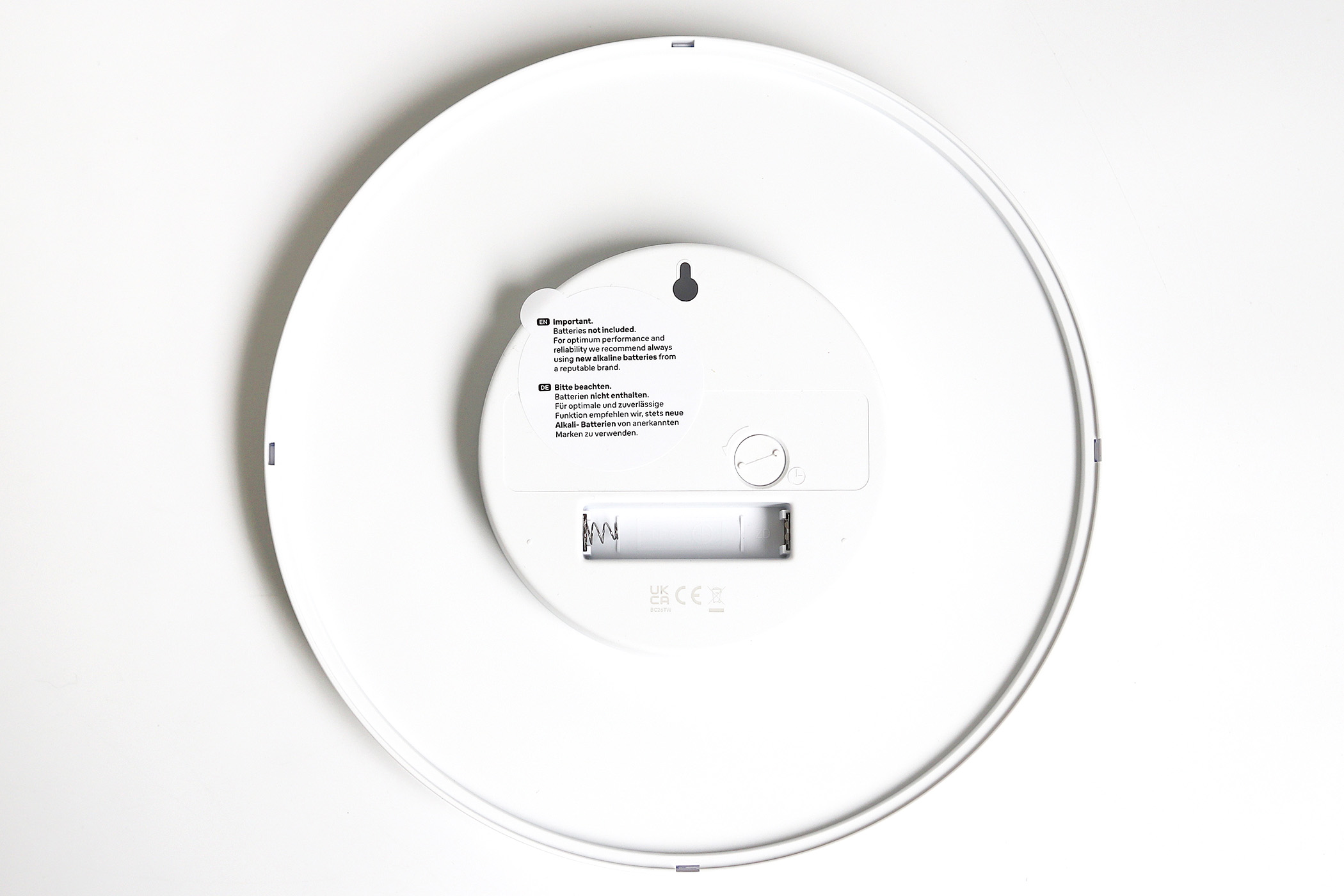 背面は単三電池一本で動くタイプ。軽いから、賃貸の壁でも余計な負担にならない。掃除ついでに外すのもラク。こういう細かいところが、日用品としてはけっこうポイントなんですよね。