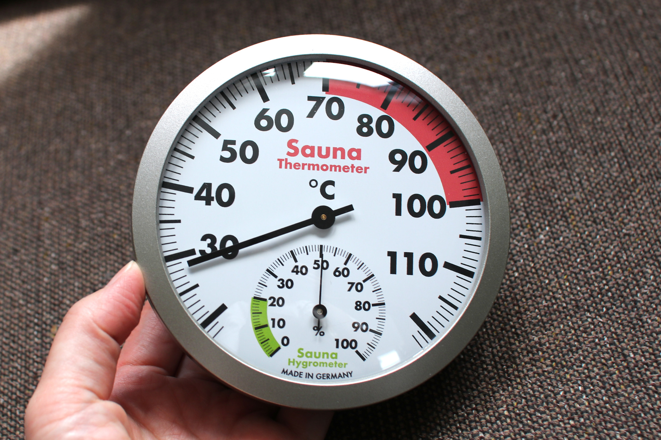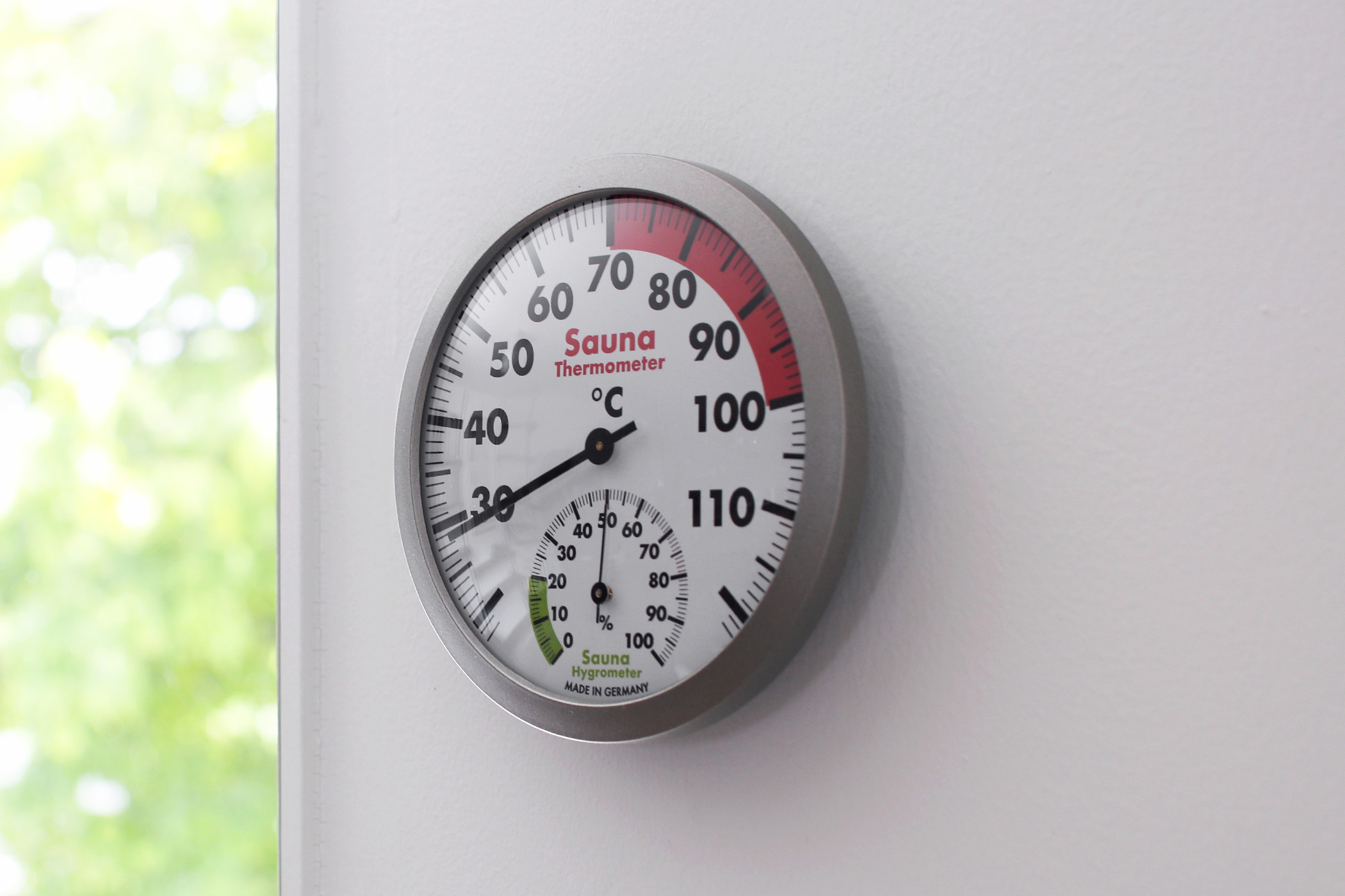サウナ室の計器がそのまま家に来たような見た目で、数値の読み取りが速い。
